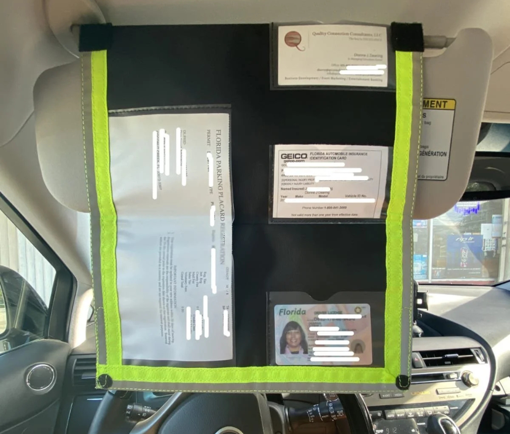 The SOS Kit is a visor-mounted organizer designed to keep essential documents — license, registration, insurance, and permit ID — visible and accessible during traffic stops.